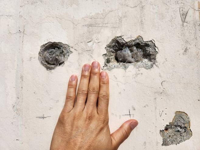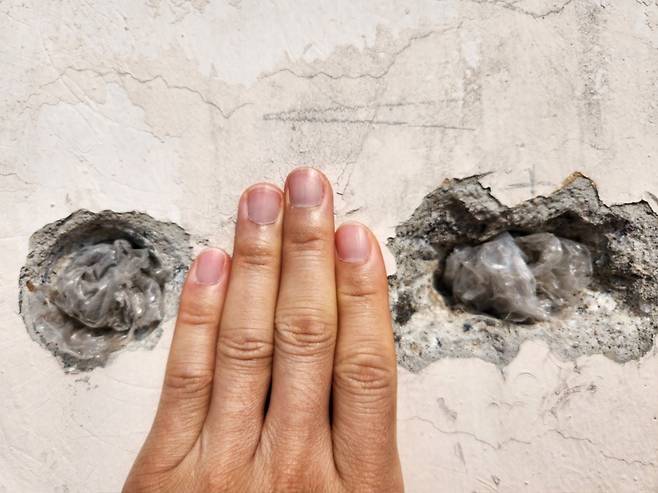 전주인이 외벽을 뚫어서 온수, 냉수 배관을 뺐던곳이고