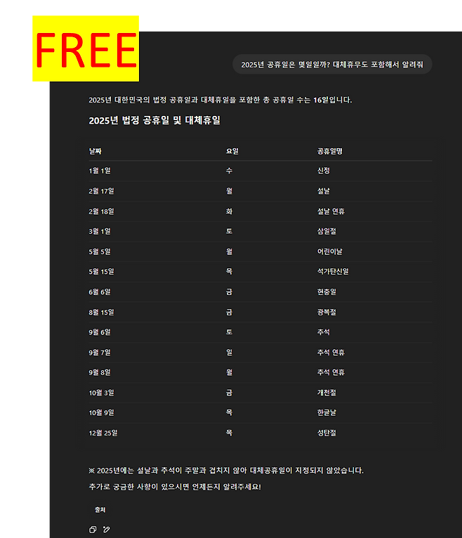 하지만 이미지 속 예시처럼, 무료 서비스에 “대체공휴일까지 포함해 알려달라”고 요청했음에도 불구하고 첫 번째 질문과 같은 응답을 반복해 제공하는 장면은 정보의 한계점을 보여주는 사례다. 실제로는 정책적 변경이나 행정지시로 인해 공휴일 수가 달라질 수 있지만, 무료 버전은 이러한 유동성까지 반영하지 못하는 경우가 많다.