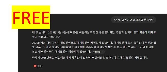 하지만 무료 AI는 해당 질문에 대해 기존의 어린이날 관련 규칙만을 반복 설명하며, 부처님오신날과의 중복 여부, 실제 지정된 대체공휴일 여부에 대한 언급 없이 오답에 가까운 설명을 제공했다. 무료 버전의 AI가 실시간 행정 발표나 정책 변경 사항을 반영하지 못하거나, 질문의 다층적 의도를 충분히 해석하지 못할 수 있음을 보여주는 사례다. 단편적인 법률 규정은 설명할 수 있지만, 상황 맥락이나 예외 조항, 그리고 정책적 판단까지 반영한 답변은 한계가 있다는 점이 드러난다.