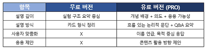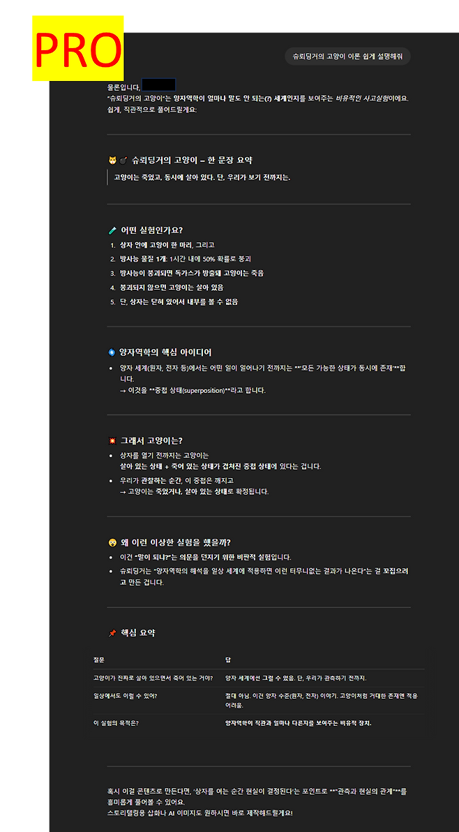 같은 질문인 “슈뢰딩거의 고양이 이론을 쉽게 설명해줘”라는 요청에 대해, 프로 버전은 보다 정제되고 체계적인 설명을 제공했다. 첫 문장부터 사용자의 이름을 불러주며 응답하는 개인화된 접근이 돋보였고, 단순한 요약을 넘어 이론이 왜 나왔는지, 어떤 의도에서 설정됐는지까지 설명을 확장하고 있었다.