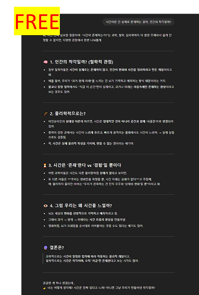 세 번째 질문은 존재론적이고 철학적인 주제였다. “시간이란 건 실제로 존재하는 걸까, 아니면 인간의 착각일까?”라는 물음에 대해, 무료 버전은 철학, 물리학, 인지과학 등 다양한 관점에서 시간 개념을 구분해 설명했다.