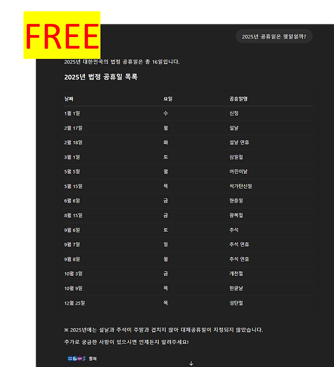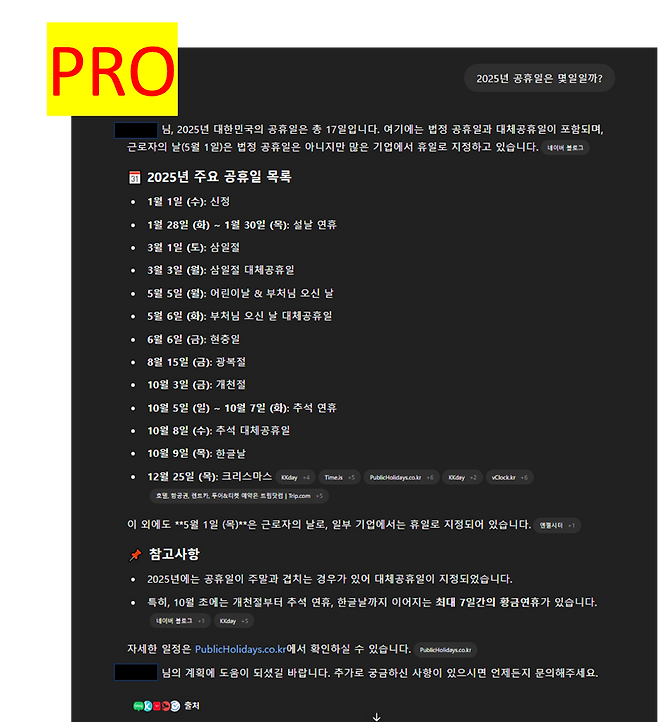 반면 프로 버전의 응답은 한층 더 풍부한 정보를 포함하고 있다. 2025년의 공휴일이 총 17일이라는 점을 시작으로, 법정 공휴일뿐만 아니라 대체공휴일까지 포함해 안내하고 있으며, 근로자의 날(5월 1일)도 비록 법정 공휴일은 아니지만 일부 기업에서는 실질적인 휴일로 적용되고 있다는 점까지 언급한다.