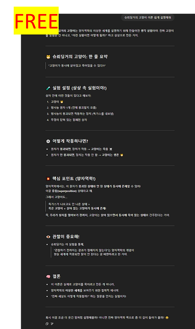 두 번째 질문은 과학 개념에 대한 요청이었다. “슈뢰딩거의 고양이 이론을 쉽게 설명해줘”라는 질문에 대해, 무료 버전은 텍스트 카드 형식으로 잘 정리된 요약 자료 형태의 답변을 제공했다. 주요 키워드는 '상자', '방사능', '죽은 고양이와 살아 있는 고양이의 중첩 상태', '관찰의 중요성' 등으로 핵심 내용을 놓치지 않았다.