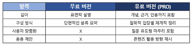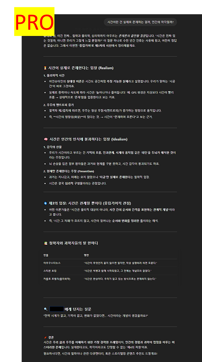 같은 질문에 대해 유료 버전은 더욱 입체적이고 정교한 답변을 제공했다. “시간이란 게 실제로 존재하는 걸까, 아니면 인간의 착각일까?”라는 질문에 대해 단순한 관점 나열을 넘어서, 철학과 물리학, 심리학까지 포괄하는 3대 관점(실재론, 관념론, 관계론)으로 나누어 깊이 있는 구조로 설명했다.
