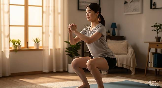 초보자는 손을 가슴 앞으로 모아 균형을 잡고, 무릎 각도를 90도 안쪽으로 조절하는 게 좋다. 너무 깊이 앉으면, 무릎에 부담이 갈 수 있다. 횟수보다 정확한 자세가 우선이다.