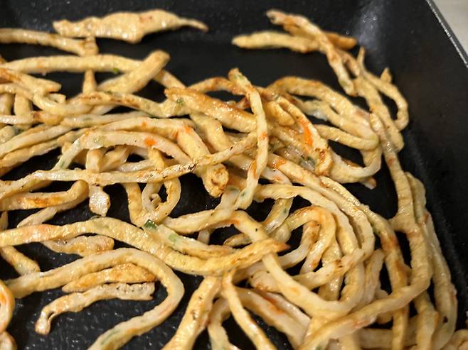얇은 사각어묵을 최대한 얇게 채 썰어 준비합니다. 그리고 팬에 볶을 텐데요. 어묵 자체가 간간하게 간이 돼있기 때문에 맛소금과 물엿만 살짝 넣어 간을 하세요.