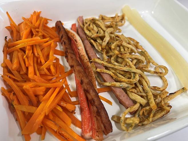 채 썬 당근과 맛살, 햄, 단무지도 준비해 주세요. 그리고 깻잎도 김밥 1개 당 2장을 준비합니다.