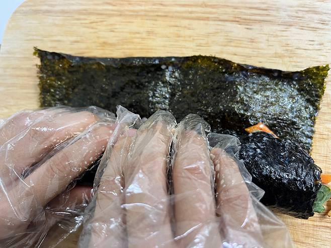 김밥을 말 때는 최대한 안쪽으로 당겨 준다는 느낌으로 말아 주세요. 그러면 김발이 없어도 예쁘게 말 수 있습니다.