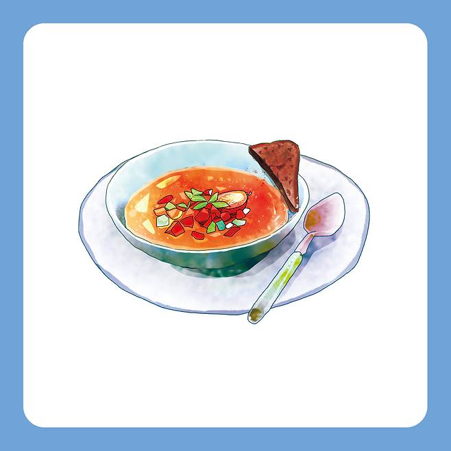 오랫동안 이슬람의 지배를 받은 스페인 남부 지방에는 이슬람의 영향을 받아 탄생한 메뉴가 많다. 아라비아어로 ‘젖은 빵’을 의미하는 ‘가스파초’도 그중 하나다. 가스파초는 이슬람 세력이 이베리아반도를 지배할 당시 농장에서 일하던 노동자들의 음식이었다. 이들은 더위를 식히고 허기를 달래기 위해 빵, 식초, 오일과 채소를 갈아 먹었다. 16세기 이후 신대륙에서 토마토가 건너와 주재료로 사용되면서 오늘날 모습을 갖췄다.
