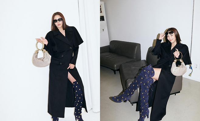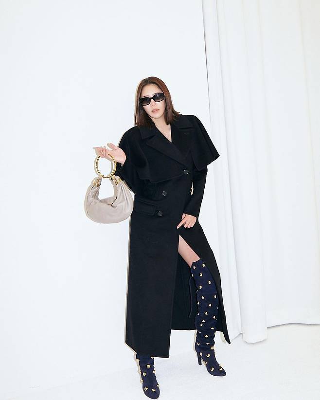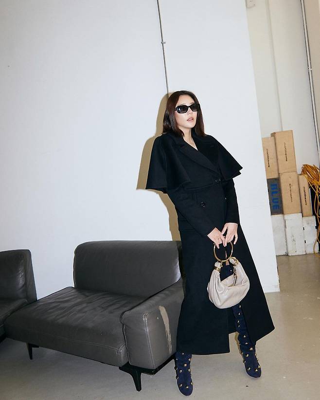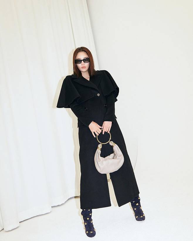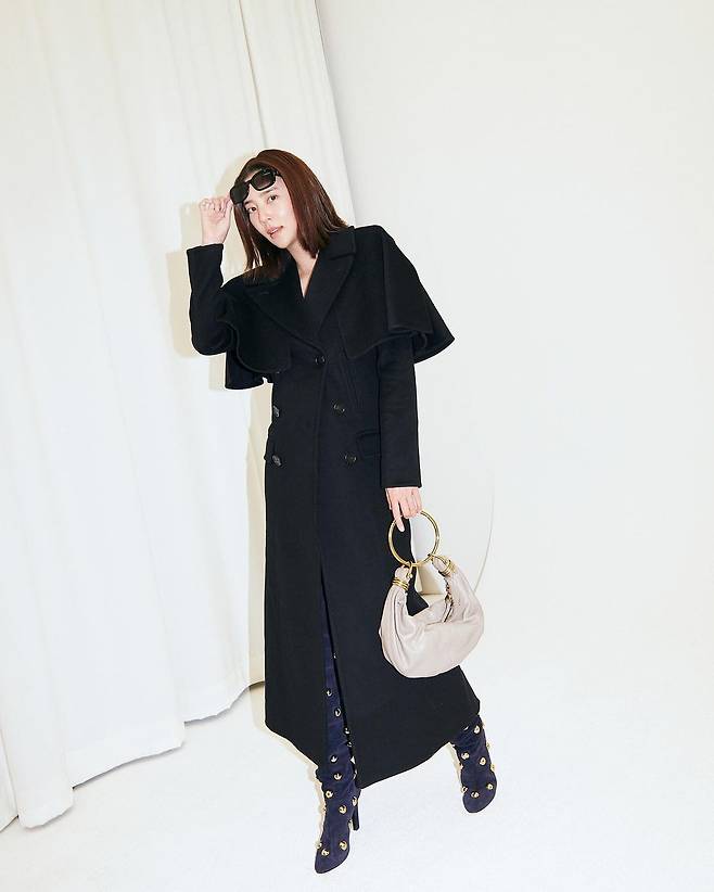 공개 된 사진 속 손담비는 블랙 컬러의 케이프 형식의 투버튼 롱 코트를 입고 세련된 스타일링을 자랑했다. 또한 블루 컬러의 금장 장식이 있는 벨벳 롱 부츠를 신어 화려함과 시크한 모습을 선보였다.