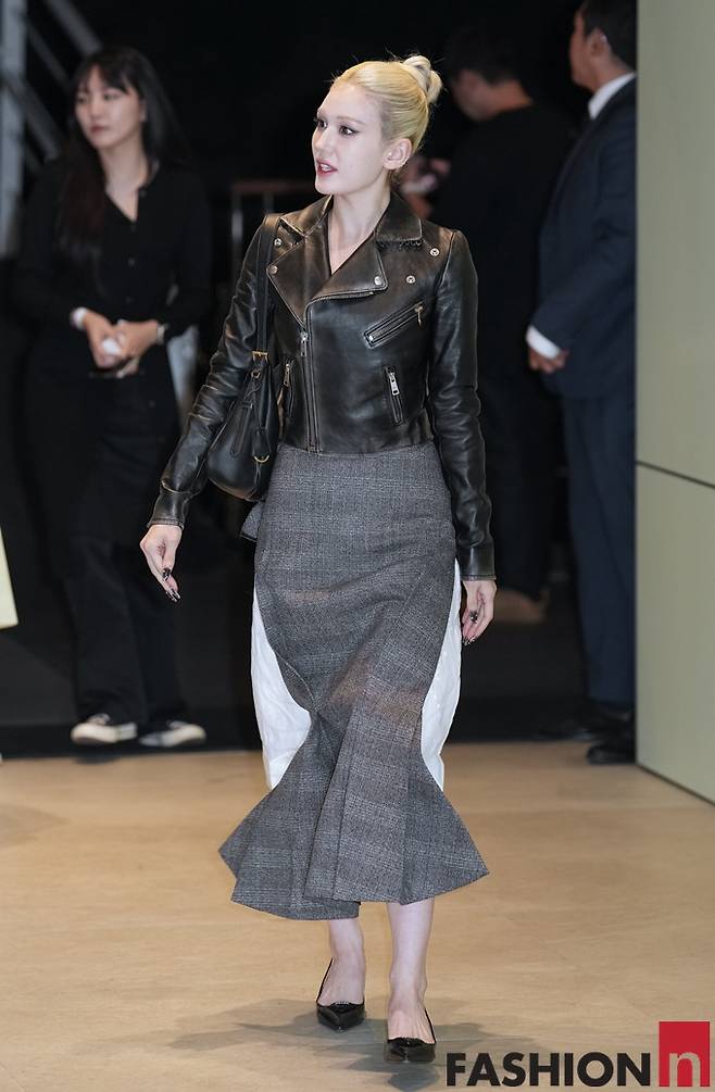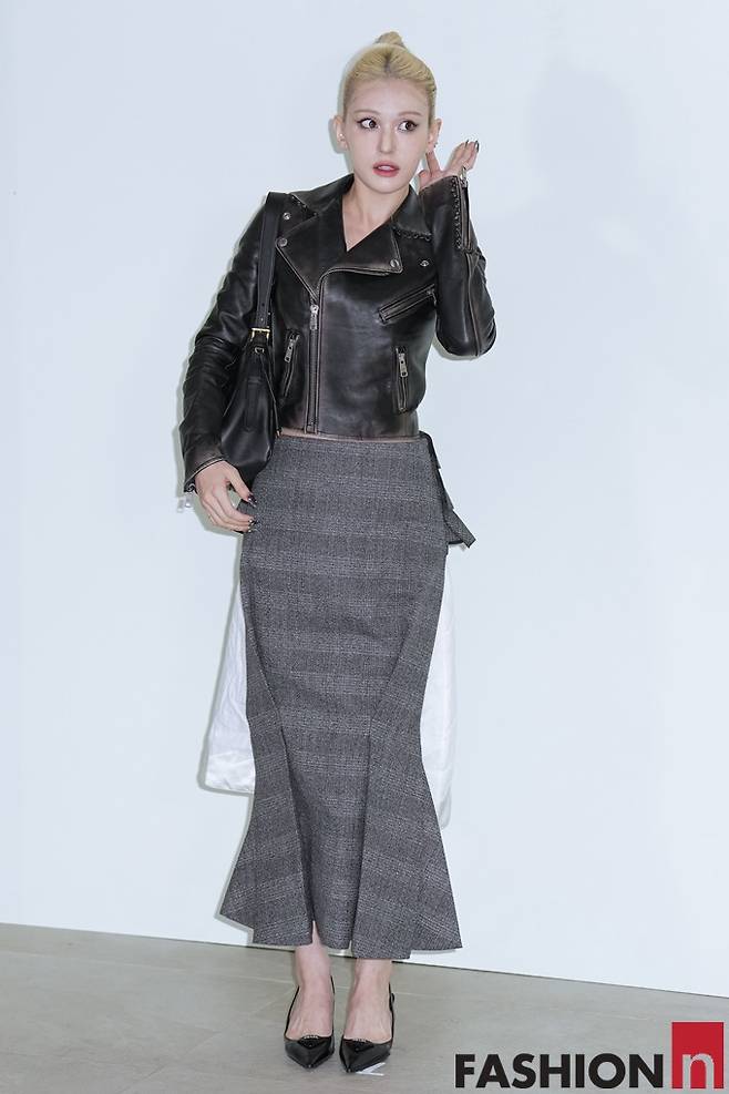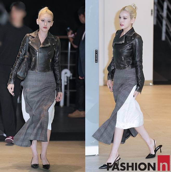 이날 전소미는 금발 헤어를 단정하게 묶고 화이트 스커트 위에 양쪽 트임이 있는 슬릿 체크 스커트를 입고 가죽 바이크 재킷을 걸친 나들이룩으로 강한 비주얼의 인형 미모를 발산했다.