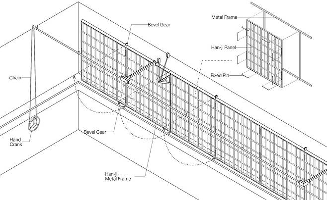 한국 전통 칸막이문인 ‘들문’에서 영감을 받았는데 들문이란 한국 전통 건축에서 사용된 벽창호로써 공기 흐름을 조절하고 공간 구분을 유연하게 변환할 수 있는 일종의 건축 시스템이다. 정확히는 들문의 개폐 방식에서 영감을 받았으며 창문 표면의 상단 가장자리를 기준으로 90도 회전하도록 설계했다.