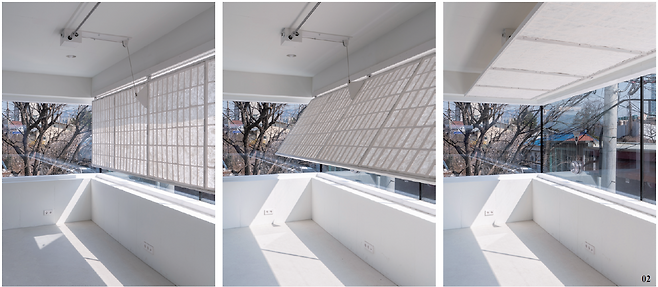 창에 부착돼 자연광의 광량을 조절하거나 반투명 스크린으로 활용할 수 있다. 충분한 햇빛을 끌어와 아늑한 분위기로 조성할 수 있고 작동기의 각도를 조절해 실내로 들어오는 광량 자체를 조절할 수도 있다. 햇빛이 없는 밤에는 창호를 열어 실내 빛을 확산시킴과 동시에 야경을 감상할 수도 있다. 이렇게 빛을 조절하고 빛을 통해 내외부를 연결한다는 것이 창호 2.0의 강점이다.