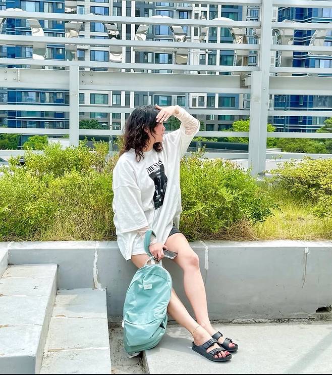 네이비 컬러의 패턴 점프슈트를 착용해 휴양지 분위기를 극대화했습니다.