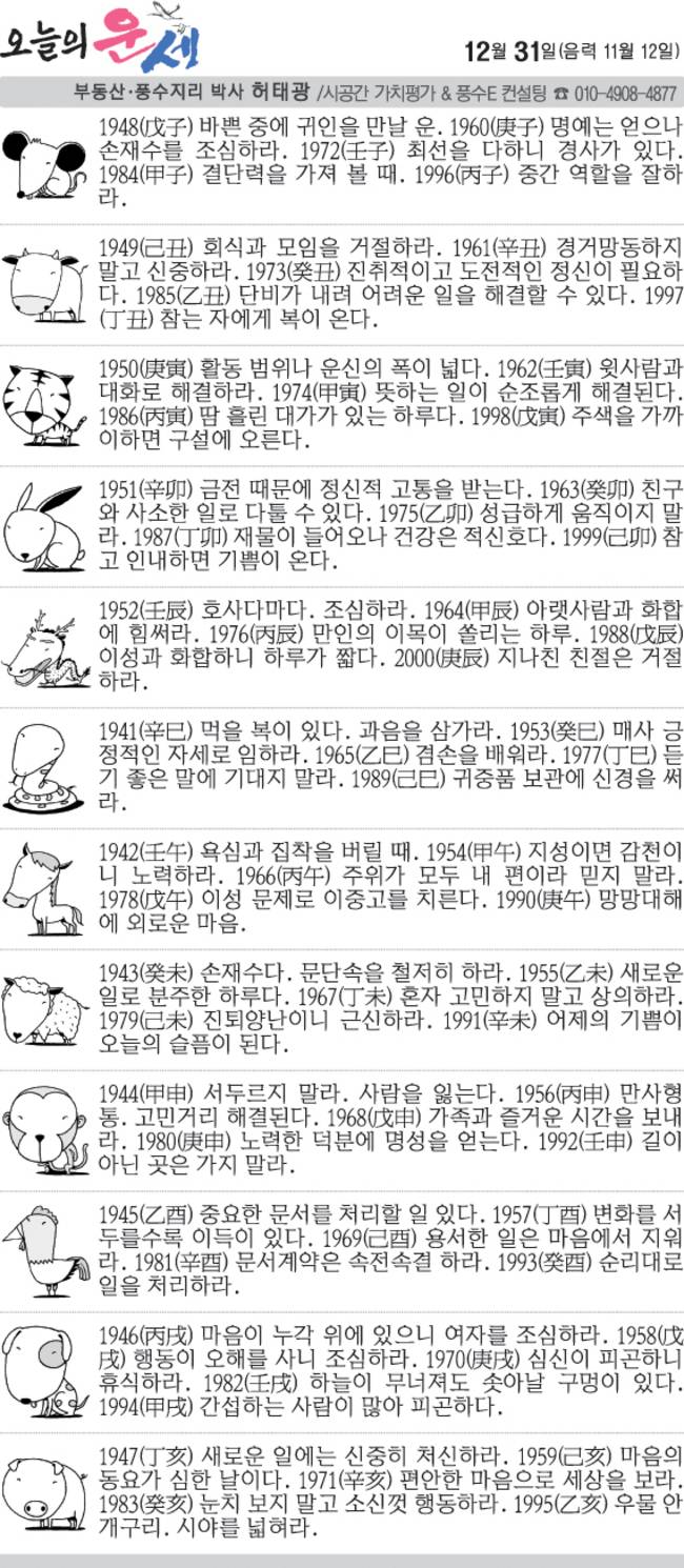 12월 31일 오늘의 운세(음력 11월 12일) 허태광 부동산·풍수지리 박사 2025. 12. 30. 19:55 음성으로 듣기 음성재생 설정 이동 통신망에서 음성 재생 시 데이터 요금이 발생할 수 있습니다. 글자 수 10,000자 초과 시 일부만 음성으로 제공합니다. 남성 여성 느림 보통 빠름 음성 재생하기 닫기 음성 재생 중지 번역 설정 번역beta Translated by kaka i 한국어 - English 영어 日本語 일본어 简体中文 중국어 Nederlands 네델란드어 Deutsch 독일어 Русский 러시아어 Malaysia 말레이시아어 বাঙ্গোল ভাষা 벵골어 tiếng Việt 베트남어 Español 스페인어 اللغة العربية 아랍어 Italiano 이탈리아어 bahasa Indonesia 인도네시아어 ภาษาไทย 태국어 Türkçe 튀르키에어 Português 포르투갈어 Français 프랑스어 हिन्दी 힌디어 닫기 번역중 Now in translation 글씨크기 조절하기 글자크기 설정 파란원을 좌우로 움직이시면 글자크기가 변경 됩니다. 가 매우 작은 폰트 작은 폰트 보통 폰트 큰 폰트 매우 큰 폰트 가 이 글자크기로 변경됩니다. (예시) 가장 빠른 뉴스가 있고 다양한 정보, 쌍방향 소통이 숨쉬는 다음뉴스를 만나보세요. 다음뉴스는 국내외 주요이슈와 실시간 속보, 문화생활 및 다양한 분야의 뉴스를 입체적으로 전달하고 있습니다. 닫기 인쇄하기