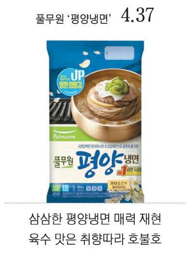 가장 많은 지지를 얻은 제품은 CJ제일제당의 '동치미 물냉면'이었다. 이 제품은 평안도식 정통 레시피로 만든 제품으로 간편식 냉면 시장에서 19년간 꾸준한 인기를 얻는 '스테디셀러'다. 제주산 겨울무로 담근 동치미 육수와 쫄깃한 면발이 특징으로 최근 리뉴얼을 통해 동치미 함량을 높이고 레몬즙을 더해 깔끔한 맛을 더했다.