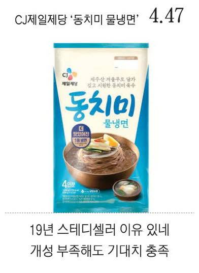 가장 많은 지지를 얻은 제품은 CJ제일제당의 '동치미 물냉면'이었다. 이 제품은 평안도식 정통 레시피로 만든 제품으로 간편식 냉면 시장에서 19년간 꾸준한 인기를 얻는 '스테디셀러'다. 제주산 겨울무로 담근 동치미 육수와 쫄깃한 면발이 특징으로 최근 리뉴얼을 통해 동치미 함량을 높이고 레몬즙을 더해 깔끔한 맛을 더했다.