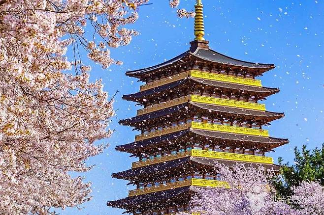 보문단지 내에는 찍는 곳마다 인생 사진이 되는 특별한 장소들이 숨어 있습니다. 가장 사랑받는 곳은 황금색 팔각 9층 탑인 '황룡원'을 배경으로 벚꽃을 담을 수 있는 화백컨벤션센터 인근 스팟으로, 고전적인 건축미와 분홍빛 꽃의 조화가 무척이나 화려합니다.