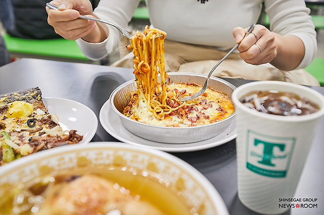 매장 입구에 위치한 ‘트레이더스 카페(T-카페)’는 오전부터 이미 만석이었다. 최근 T-카페는 ‘가성비 외식 핫플’로 입소문을 타며 방문객이 급증하고 있다. 이곳에선 지름 45cm의 대형피자를 1만 원 후반대에, 쌀국수, 스파게티 등을 7천 원대 이하로 판매한다.