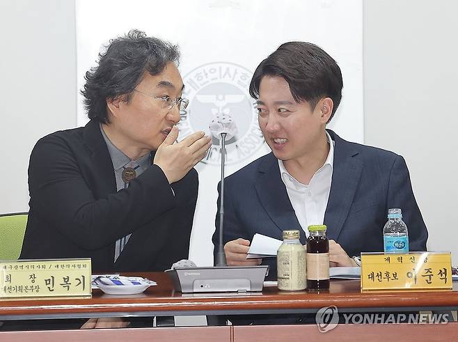(대구=연합뉴스) 류영석 기자 = 13일 개혁신당 이준석 대선 후보가 대구광역시의사회관에서 열린 대구광역시의사회·경상북도의사회 지역의료 현안 간담회에서 민복기 대한의사협회 대선기획본부장과 대화하고 있다. 2025.5.13