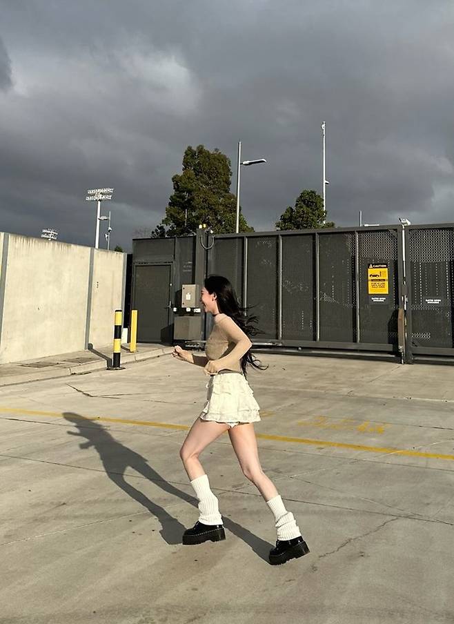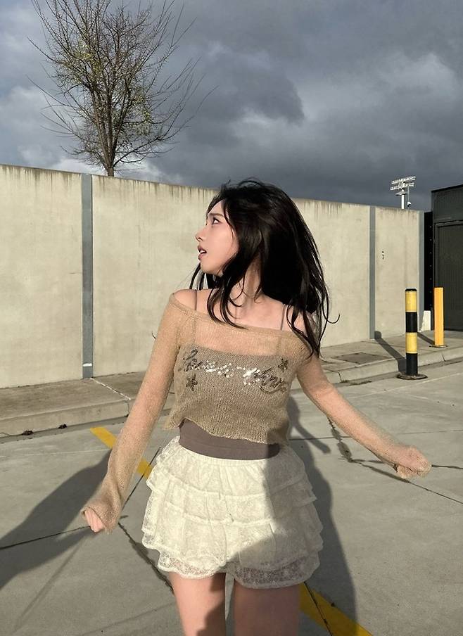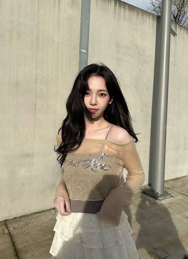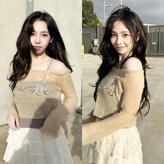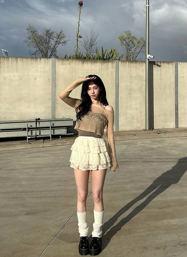 공개한 사진에서 카리나는 늘씬한 각선미가 드러나 티어드 프릴 미니 스커트에 갈색 탱크톱을 입고 시스루 톱을 레이어드한 스타일로 매혹적인 미모를 드러냈다.