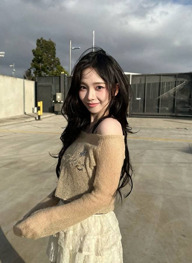 그룹 에스파의 카리나가 티어드 미니 스커트에 시스루 걸리시룩으로 깜찍한 요정미를 발산했다.