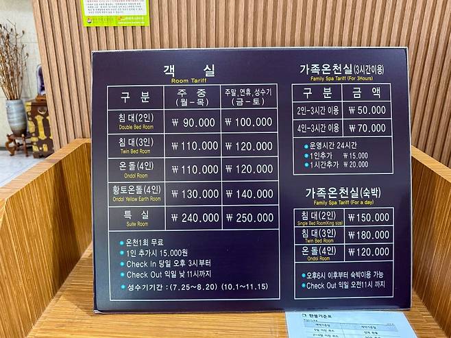 찜질방 요금: 성인 20,000원 / 어린이 15,000원