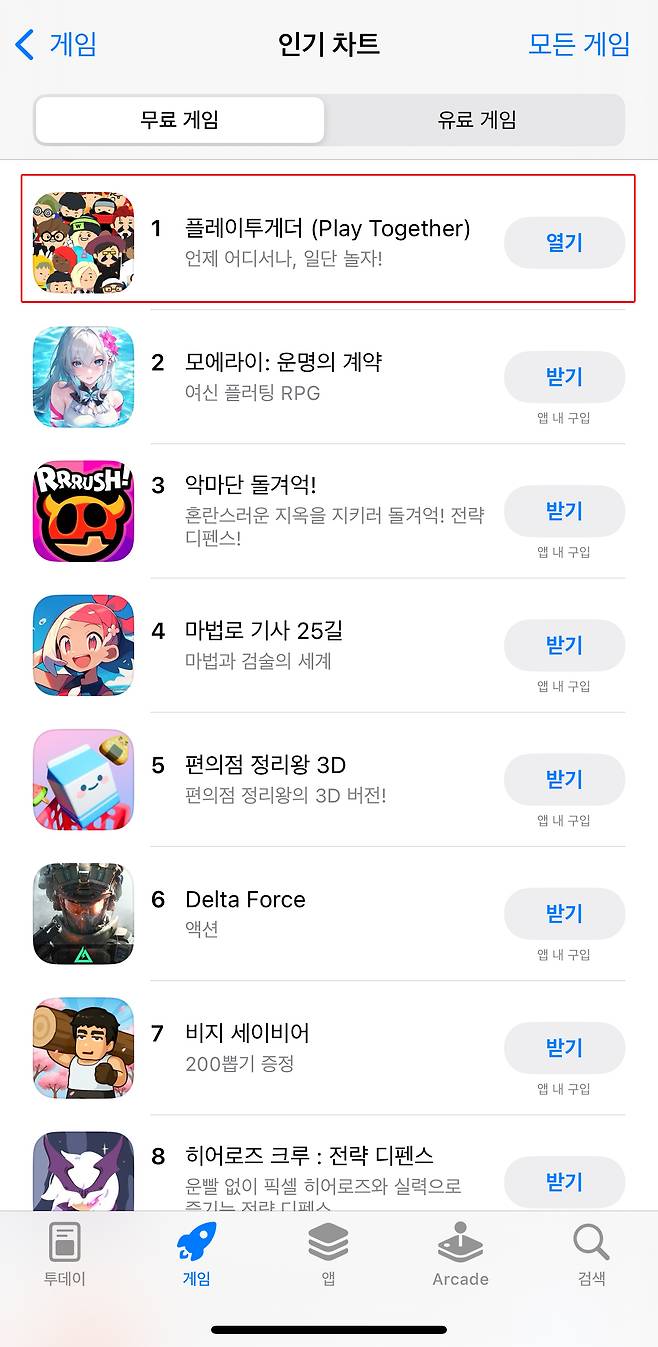 해긴이 서비스하는 소셜 네트워크 게임 '플레이투게더'가 아이폰 무료 게임 순위 1위에 오르며 차트 역주행을 달성했다.