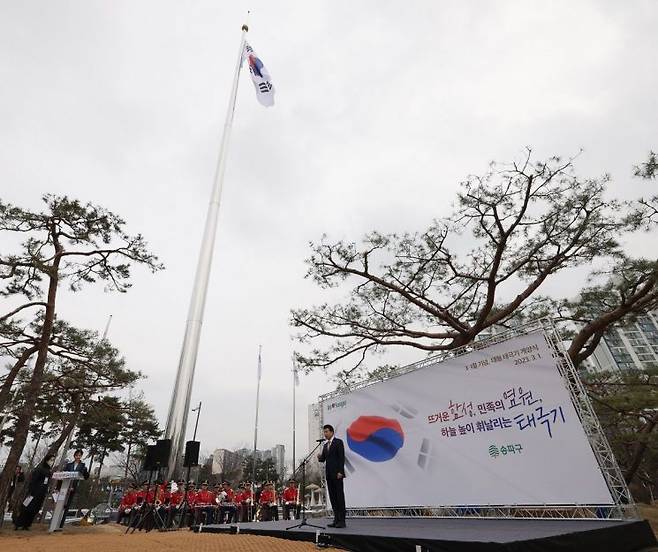 송파구, 3.1절 55m 대형 태극기 게양식 개최...서강석 구청장 '나라 사랑'
