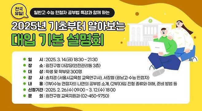 광진구(구청장 김경호)가 3월14일 학생 및 학부모를 대상으로 ‘2025년 기초부터 알아보는 대입 기본 설명회’를 개최한다.