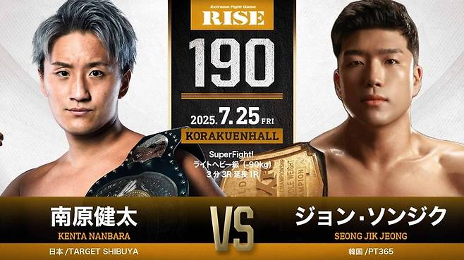 국내 최대 입식격투기 단체 MAXFC의 슈퍼미들급 챔피언 정성직이 다음달 25일 일본 도쿄 고라쿠엔 홀에서 열리는 라이즈 190에서 일본 라이트헤비급 챔피언 난바라 켄타(27, TARGET SHIBUYA)와 대결한다.