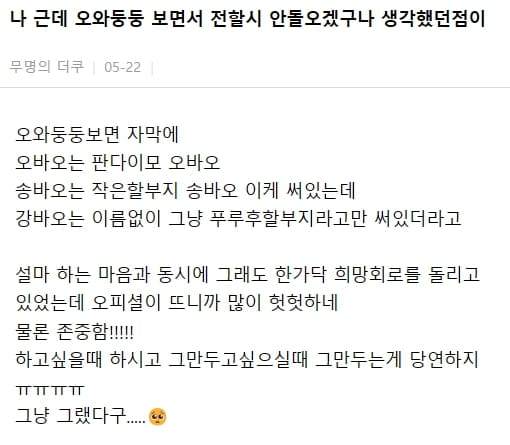 한편, 오바오 이모의 '오와둥둥'에 출연하는 강바오 할아버지를 보고 '전할시'가 돌아오지 않을 것이라 예상한 팬들도 있었습니다.