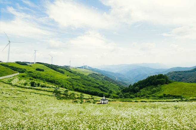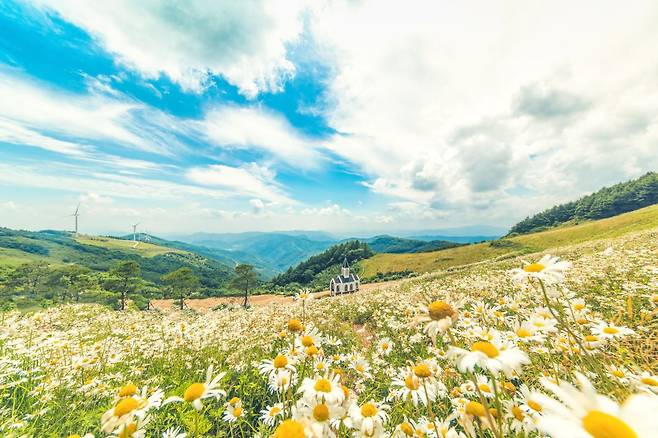 해발 1,200m 청옥산 자락에 펼쳐진 평창 육백마지기는 매년 6월이면 순백의 샤스타데이지가 초원을 가득 메워 한국 알프스라는 별명이 아깝지 않을 정도의 장관을 보여줍니다.