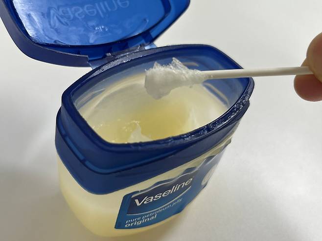 면봉으로 바세린을 소량 덜어 냅니다. 치약도 작은 그릇에 덜어 주세요.