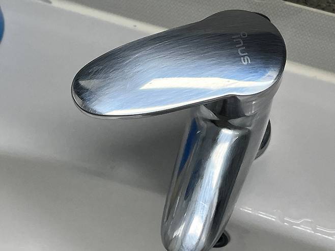 잔여물이 남았으면 물로 가볍게 헹궈 주세요. 그리고 다시 마른 수건으로 닦습니다. 수전의 얼룩이 모두 지워지고 광이 납니다.