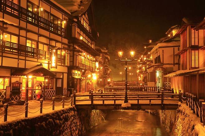 긴잔 온천의 가장 아름다운 순간은 눈 내리는 밤이라 할 수 있습니다. 하얀 눈으로 뒤덮인 온천의 건물과 어둠이 감싸안은 듯한 분위기 속에서 나지막이 빛을 내는 등의 조화는 상당히 로맨틱한 경험을 선사합니다.
