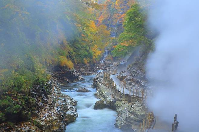 협곡 초입에는 캠핑장이 있고, 길을 따라 민박과 온천 료칸들이 위치하고 있습니다. 특히 가을에 방문한다면 협곡과 어우러진 단풍 군락과 함께 오야스쿄 협곡의 신비로운 풍광, 그리고 협곡의 랜드마크인 ‘기와하라 온천교’도 즐기실 수 있어요.