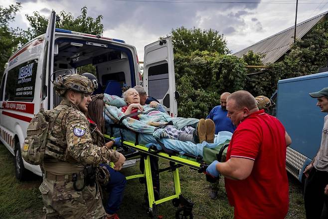 | 러, 우크라 동부선 민간인 표적 공습 9일 우크라이나 동부 도네츠크주 슬로우얀스크에서 러시아군의 공습을 받은 86세 여성 올라 트루시 씨가 응급차에 이송되고 있다. 이날 슬로우얀스크 인근 야로바 마을에서 트루시 씨를 포함한 우크라이나 노인 수십 명이 러시아의 활공 폭탄 공격을 받고 숨지거나 부상당했다. 슬로우얀스크=AP 뉴시스 |