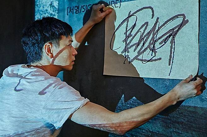 -한치원(강동원)이 감옥에서 변재욱(황정민)이 시킨대로 양민우 검사(박성웅)의 사인을 똑같이 차용하기 위해 연습하는 장면.