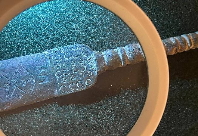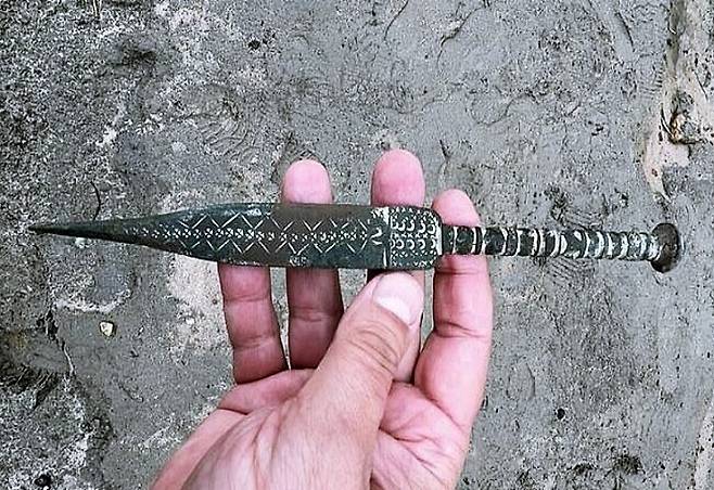 이어 "고고학에 관심이 없는 사람들 눈에도 가치가 충분해 보이는 이 단검은 기원전 500년 무렵의 물건"이라며 "길이 약 24.2㎝의 합금 검신에 새겨진 초승달과 별, 기하학적 문양은 고대 의식이나 종교행사와 연관성을 떠올리게 한다"고 덧붙였다.