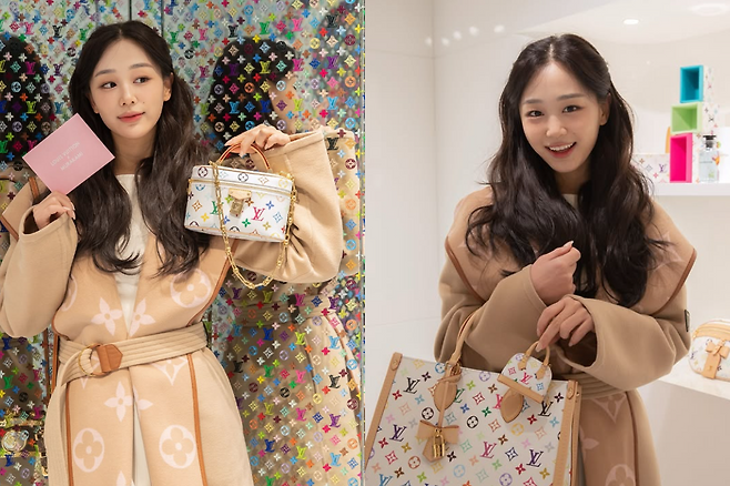 이주영은 화려한 명품 브랜드 아이템을 적극 활용하면서도 부담스럽지 않은 스타일링을 선보이며 감각적인 패션을 완성한다.