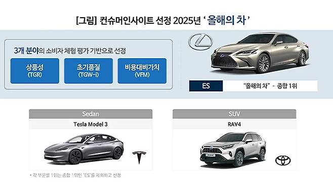 자동차 리서치 전문기관 컨슈머인사이트(Consumer Insight)가 발표한 ‘2025 올해의 차’에서 렉서스 ES가 종합 1위에 올랐다.