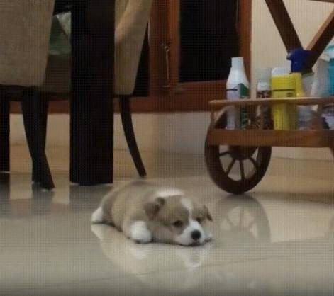 그 몇 걸음이 얼마나 큰 용기였을까요. 마치 “이쪽으로 가도 괜찮을까?”라고 묻는 듯한 눈빛과 낯선 공간에 대한 두려움도 살짝 묻어납니다. 그리고 얼마 지나지 않아, 강아지는 결국 털썩—작고 부드러운 몸이 바닥에 그대로 누워버립니다. 그 순간, 힘이 빠진 듯한 표정 속에는 살짝 억울한 듯한 기색도 담겨 있습니다. "이거 생각보다… 너무 힘든데?" 하는 듯 말이죠.
