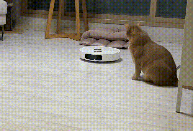 A. 초반에는 모모가 로봇청소기를 싫어했는데 지금은 지켜보는 정도로 적응했답니다.