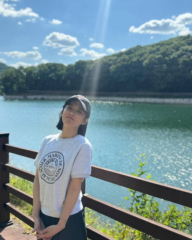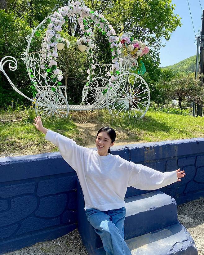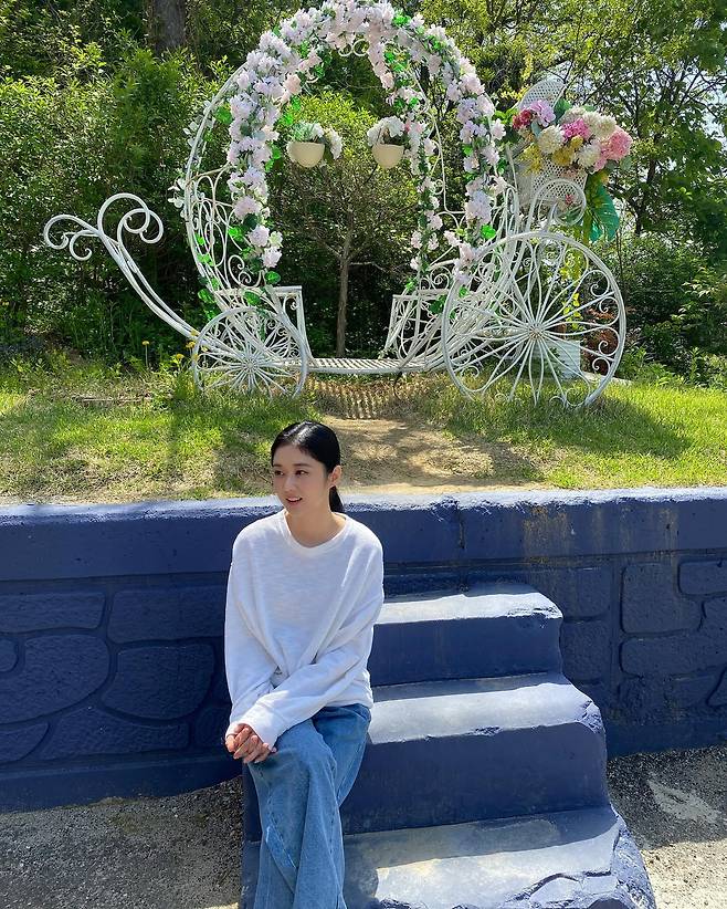 파스텔빛 꽃 장식과 푸른 풍경을 배경으로 한 사진에서는 그녀 특유의 청량함이 더욱 강조되었어요.