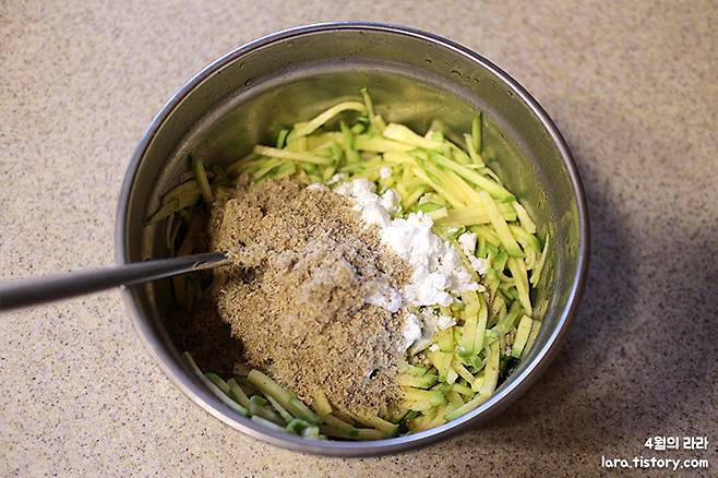 절여진 애호박에 새우가루와 전분을 넣어 촉촉하게 버무립니다. 따로 물을 추가하지 않아도 애호박에서 나온 수분으로 자연스레 반죽이 됩니다.