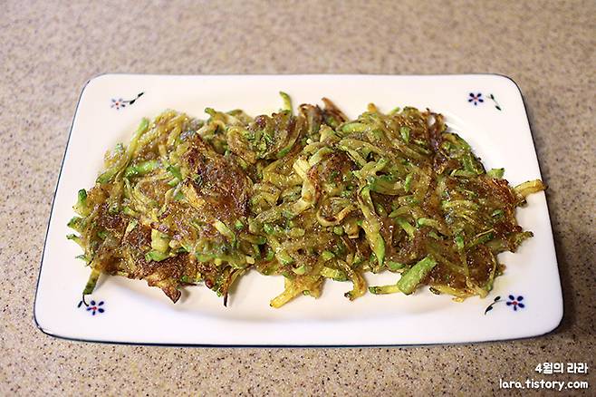 노릇노릇 고소한 향이 솔솔~ 새우가루 덕분에 감칠맛이 확 살아난 밀가루 없는 애호박부침개가 완성됐습니다. 그냥 먹어도 맛있고 간장에 살짝 찍어 먹어도 굿!
