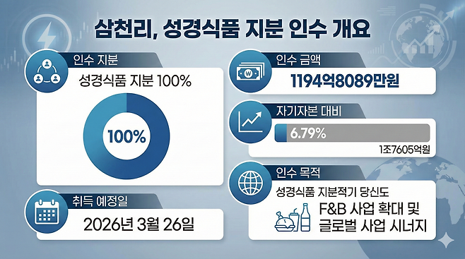28일 금융감독원 전자공시시스템에 따르면 삼천리는 사모펀드(PEF) 운용사 어펄마캐피탈이 보유한 성경식품 지분 100%를 1194억8089만원에 인수하기로 했다. 이는 삼천리의 지난해 말 자기자본 1조7605억원 대비 6.79%에 해당하는 규모로, 취득 예정일자는 2026년 3월26일이다.
