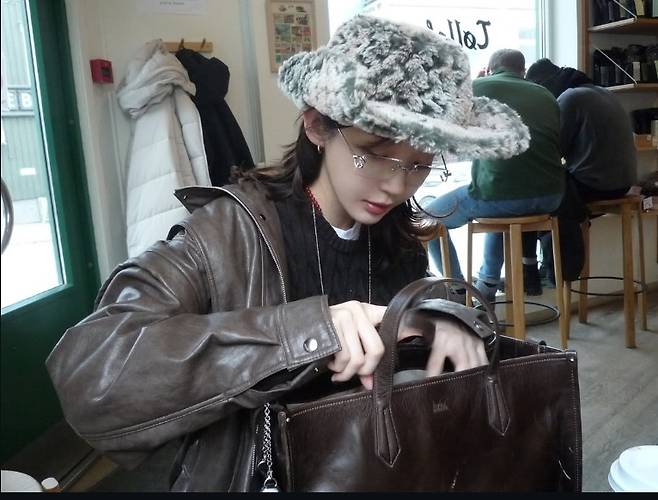 특히 퍼가 돋보이는 카우보이 스타일의 모자와 클래식한 브라운 레더 재킷은 감각적인 레트로 무드를 완성했습니다.