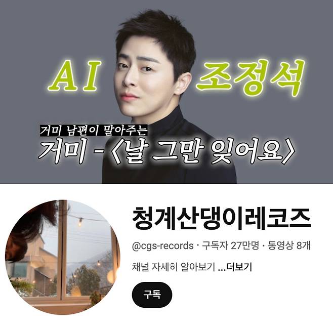 조정석은 노래 유튜버 ‘청계산댕이레코즈'로 활동하고 있습니다. 지난 1월, 유튜브 채널 ‘청계산댕이레코즈'에 거미의 ‘날 그만 잊어요' 조정석 AI 버전이 올라왔는데요. AI라고 하기엔 너무나 사람 같았던 목소리에 모두가 이 유튜버의 정체를 확신했죠. 아직까지도 조정석 본인이 공식적으로 인정한 적은 없지만, ‘청계산댕이레코즈'가 사용하는 기타가 팬들이 조정석에게 선물한 것이고, <최고다 이순신>에서 함께 호흡을 맞췄던 아이유가 직접 ‘청계산댕이레코즈' 영상을 인스타그램 스토리에 올리며, ‘청계산댕이레코즈=조정석'으로 기정사실화된 상태입니다.